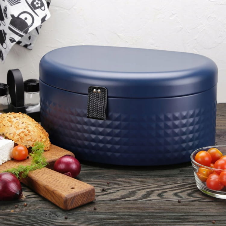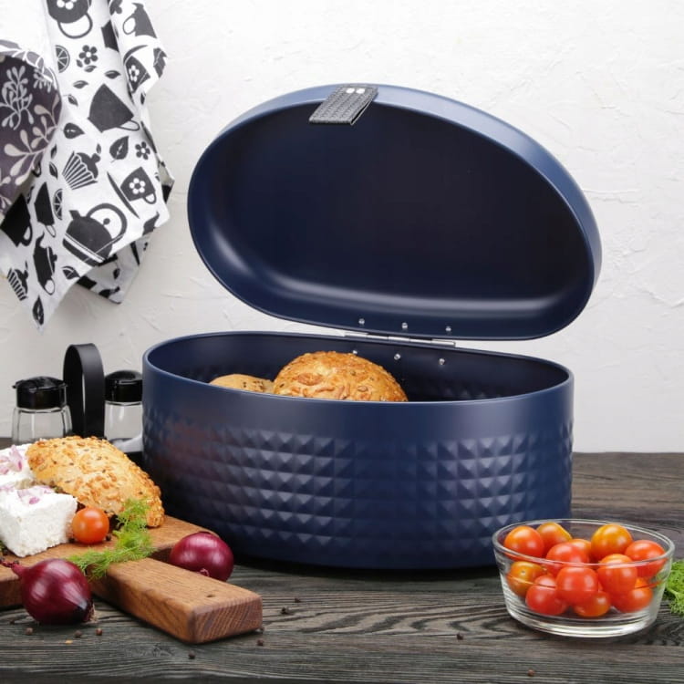 Jest wykonany z trwałego metalu, który pomalowano proszkowo na elegancki, granatowy kolor. Co więcej, posiada praktyczny uchwyt unoszący pokrywę i ułatwiający wyjmowanie i wkładanie produktów.
