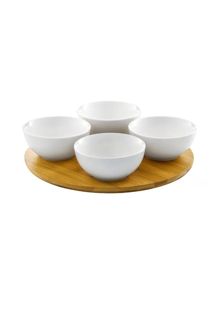 Miseczki wykonane z wysokiej jakości porcelany, podstawa natomiast z trwałego i naturalnego drewna bambusowego. Wycięcia na palce w podstawie ułatwiają przenoszenie.