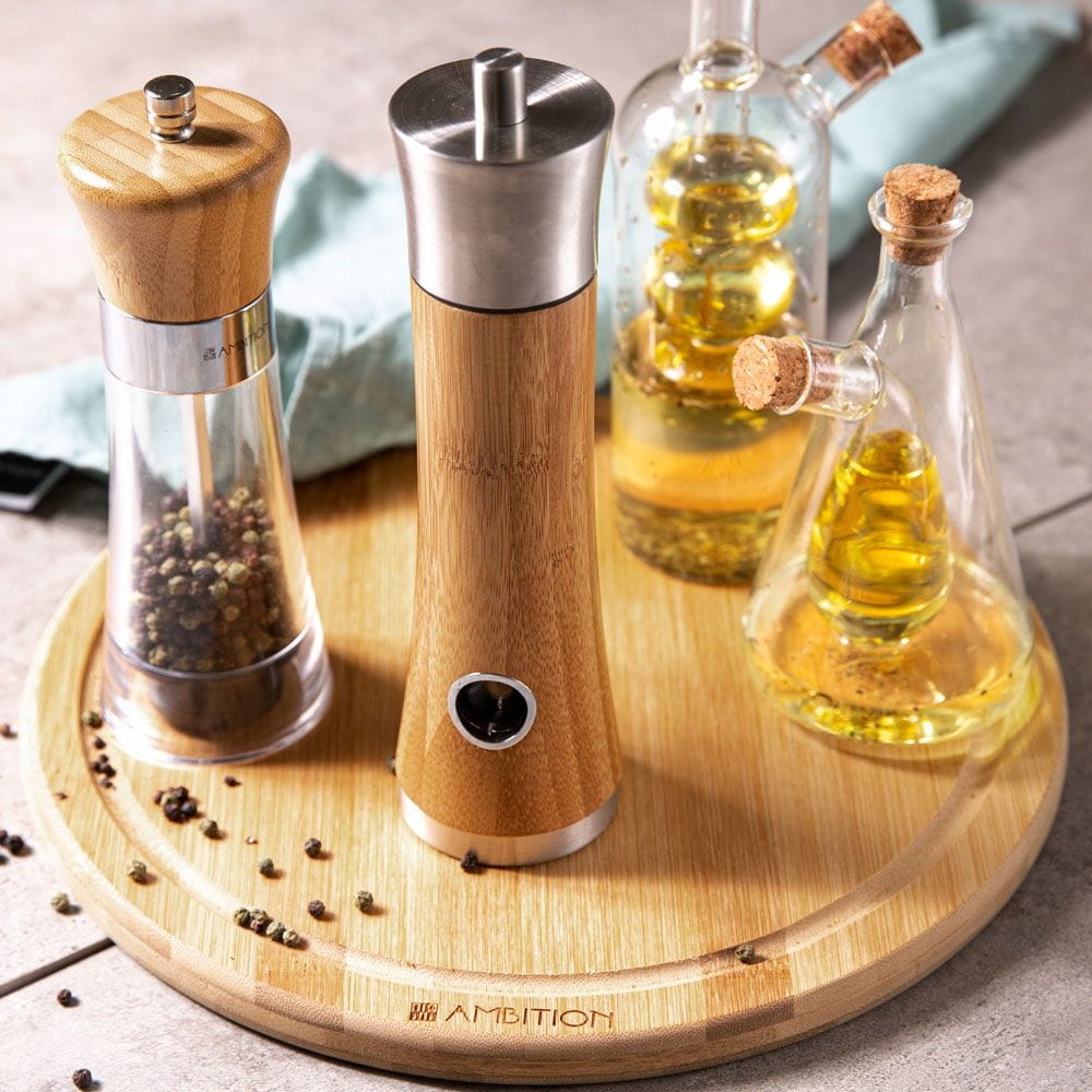 Młynek do pieprzu lub soli z ceramicznym mechanizmem. Wykonany jest z trwałego drewna bambusowego. Okienko w obudowie pozwala zobaczyć co jest w środku.