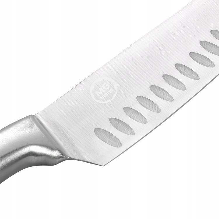 Santoku przyda się zarówno przy porcjowaniu dużych kawałków mięs, jak i siekaniu drobnych warzyw. Nóż MG Home Professional Santoku ma ostrze o długości 20,3 cm i ergonomiczną rączkę wykonaną z połączenia stali i ABS.