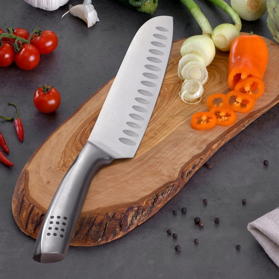Delikatne żłobienia na ostrzu pomagają w krojeniu dużych porcji mięs czy serów. Konstrukcja noży Santoku stanowi idealny kompromis pomiędzy dużym nożem szefa kuchni a tasakiem.