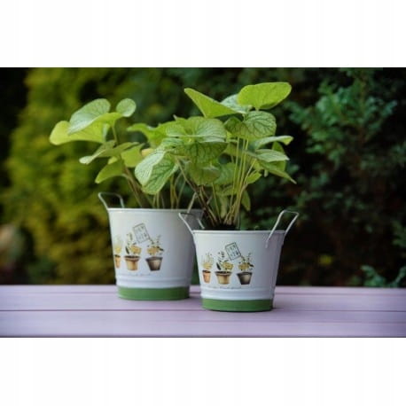 Metalowa osłonka Herbs 16 cm pomieści drobne przedmioty, spełni również funkcję oryginalnej osłonki na doniczkę z ziołami lub roślinami ozdobnymi. Wykonane z metalu, malowane, zdobione grafiką mają niepowtarzalny urok retro. Dzięki odpowiedniej wielkości i kształtom, idealnie nadaje się na osłonkę na doniczkę. Mogą być wykorzystane jako pojemnik na drobiazgi. Dzięki uchwytom posiadają jeszcze większy urok stylizacji. Osłonka nadaje się zarówno do wnętrz jak i tarasów czy ogrodów.