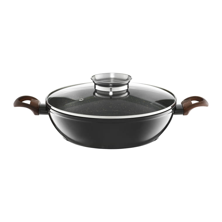 Elegancka czerń i rączki w kolorze ciemnego drewna. Wykonana w odkuwanego aluminium, odpornego na odkształcenia. Wewnątrz pokryta powłoką nieprzywierającą Qualum Basic Stone Edition z drobinkami w kolorze złota, która jest wysoko odporna na ścieralność.