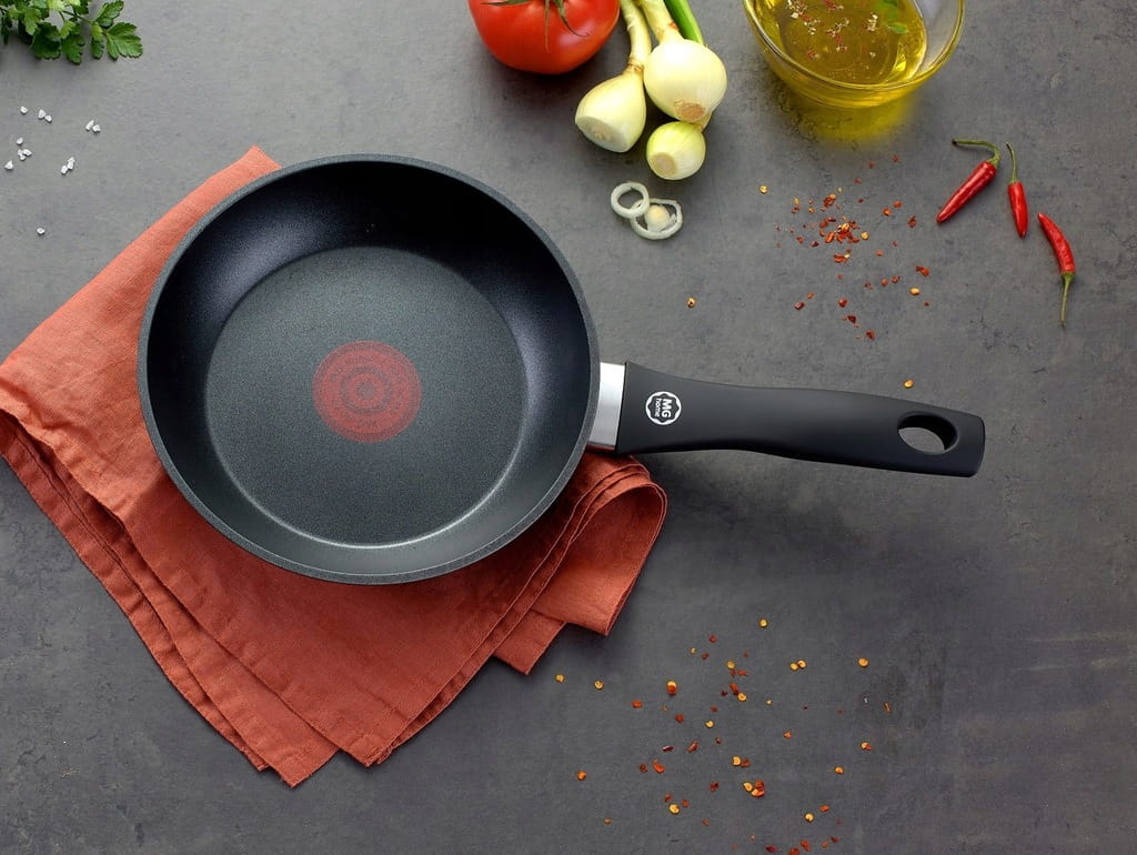 Dodatkowo patelnia została wyposażona we wskaźnik Thermo Sensor, który zmienia kolor na czerwony, gdy patelnia osiągnie idealną temperaturę smażenia.