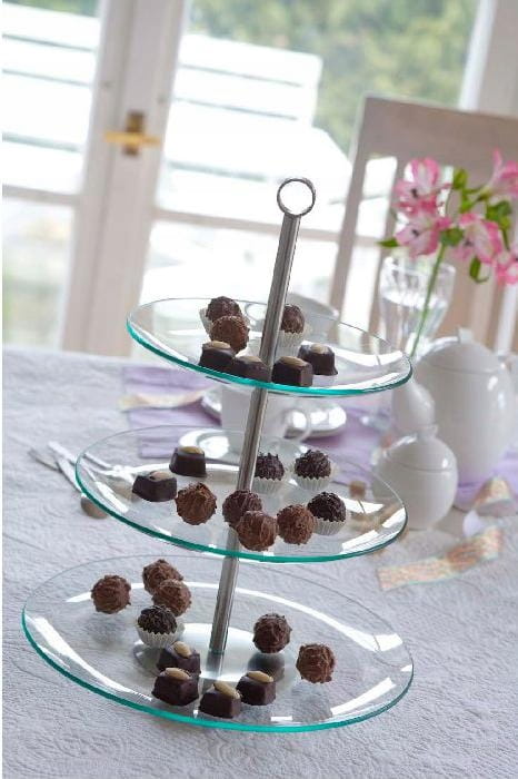 Patera Leila 3-poziomowa, marki Ambition. Wykonana z wysokiej jakości szkła oraz stali nierdzewnej. Idealna do serwowania wszelkich deserów i smakołyków (babeczek, ciasta, czekoladek, pączków i owoców).