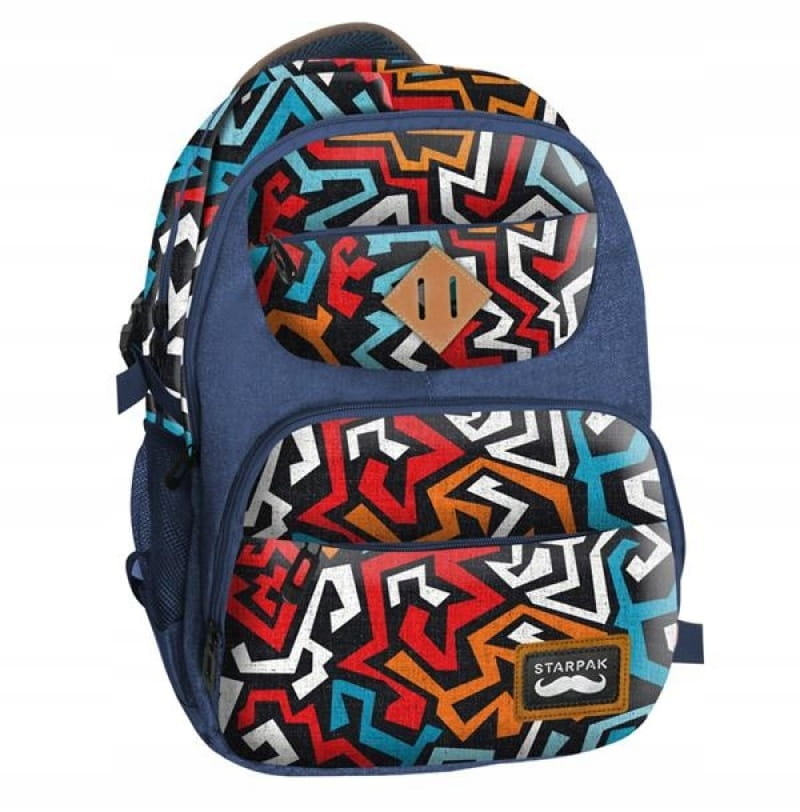 Plecak szkolny z usztywnionymi, wypełnionymi gąbką plecami i szelkami. Plecak posiada dwie pojemne komory oraz wiele zewnętrznych kieszonek na drobiazgi.