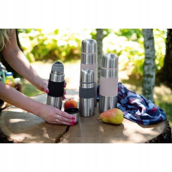 Cechą godną uwagi jest element tworzywa sztucznego, który spełnia zadanie antypoślizgowego uchwytu. Posiada wygodny, automatyczny, wkręcany korek oraz nakręcany kubek.