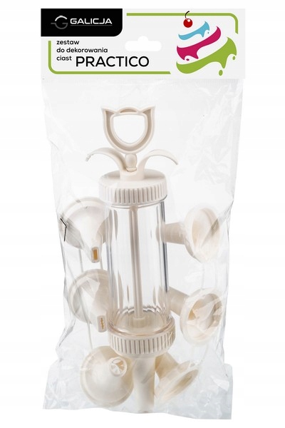 Zestaw PRACTICO został wykonany z wysokiej jakości tworzywa sztucznego. Składa się na przezroczystą szprycę, przez którą możemy obserwować masę oraz 7 wymiennych końcówek o różnorodnych kształtach.